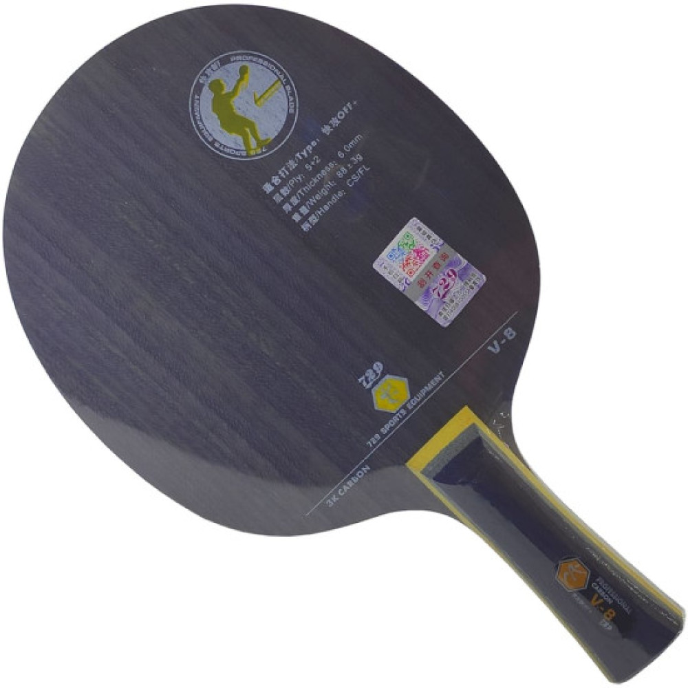 Основа 729 V-8 рекомендована атакуючим гравцям. Швидкісна семишарова основа, при виготовленні якої використані п'ять шарів професійної деревини та два шари висоякісного 3К Carbon, які розташовані глибоко від поверхні. Швидка з відмінними показниками контролю основа з достатньо великою плямою відскоку. Має слабку вібрацію та відносно дзвінкий відскік; важить 90 грам. Вдосконалена зручною FL рукояткою, яка не вислизає під час гри.