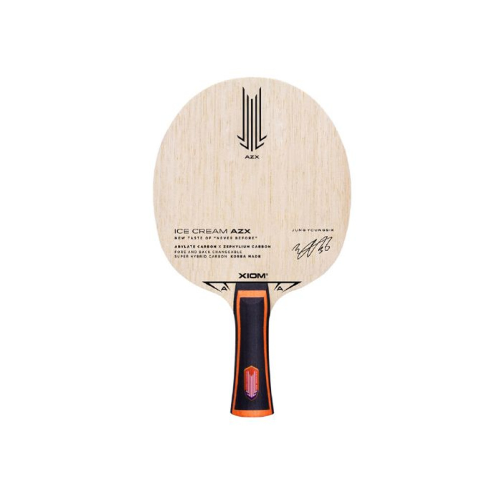 Xiom Ice Cream AZX имеет внешний слой кото, внутренний слой лимбы и ядро кири. Однако, зажатый между слоями кото и лимба, AZX имеет синтетические слои ZLC (Zephylium Carbon) с одной стороны и слой ALC (Arylate Carbon) с другой стороны. Это позволяет его пользователю иметь разные игровые характеристики на каждой стороне. ALC обеспечивает более жесткое и пружинящее ощущение, в то время как ZLC обеспечивает более мягкое и эластичное ощущение. Разница этих слоев чувствуются сразу в большинстве ударов и приемов. Это действительно особенное основание, которое позволяет адаптировать его к вашему стилю игры.
